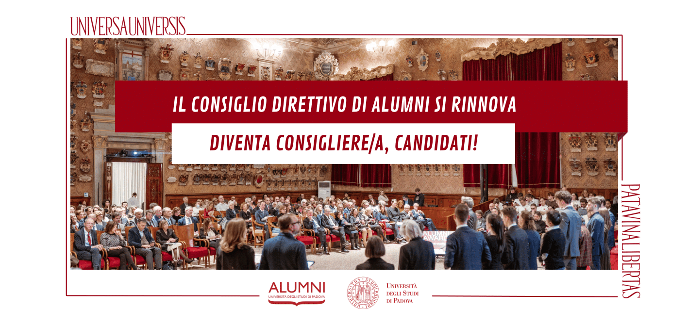 Il Consiglio Direttivo dell’Associazione Alumni dell’Università degli Studi di Padova si rinnova! Sono ufficialmente aperte le candidature al ruolo di Consigliere per il triennio 2024-2027. Il Consiglio Direttivo: funzioni e composizione Il Consiglio Direttivo è l’organo che indirizza le attività dell’Associazione, indica le linee guida del programma annuale e ne controlla la realizzazione. Si compone di 12 … Leggi tutto IL CONSIGLIO DIRETTIVO DELL’ASSOCIAZIONE ALUMNI SI RINNOVA: APERTE LE CANDIDATURE PER IL TRIENNIO 2024 – 2027